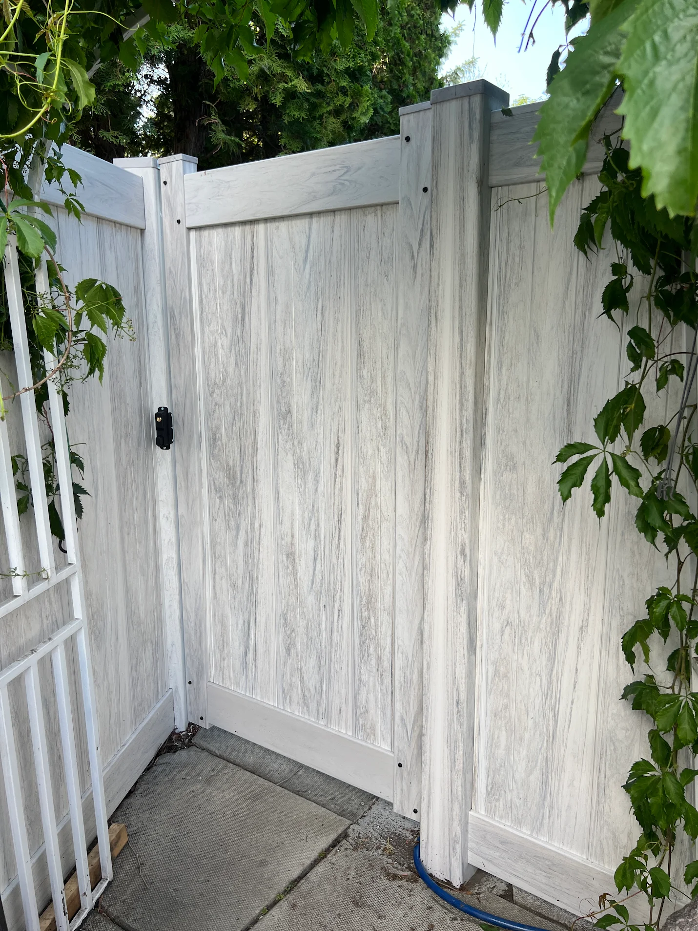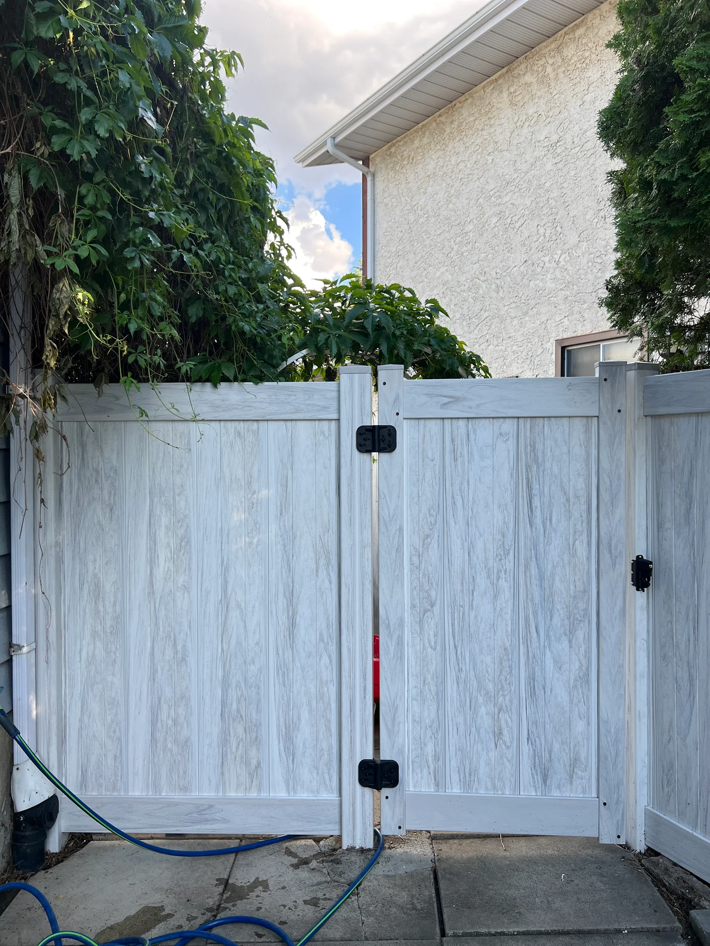 Emmett, the owner of Diverse Contractors, and his partner built a vinyl fence using a durable good quality product. They took care of all the take down including the removal of the old fence. The new fence was built in record time. After installing the gate Emmett attached a locking mechanism that actually comes with keys so you can lock the gate if you want.